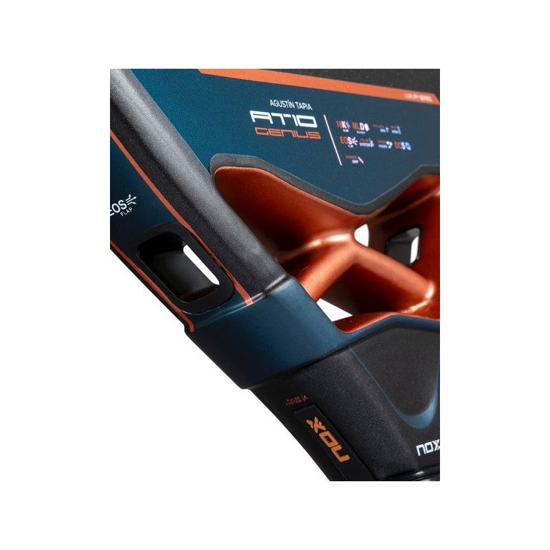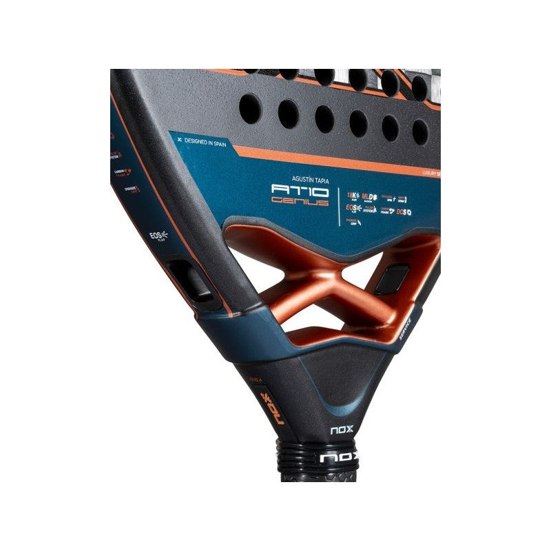 La Nox AT10 Genius Attack 18K Alum By Agustín Tapia 2025 es una paleta de pádel de alta gama creada para los jugadores más exigentes. Diseñada junto al profesional Agustín Tapia y perteneciente a la prestigiosa Luxury Series 2025, esta paleta destaca tanto por su rendimiento como por su diseño exclusivo en tonos negro, azul y bronce. Gracias a su formato diamante y los planos en carbono 18K Alum, está diseñada para maximizar la potencia sin perder control en el juego.